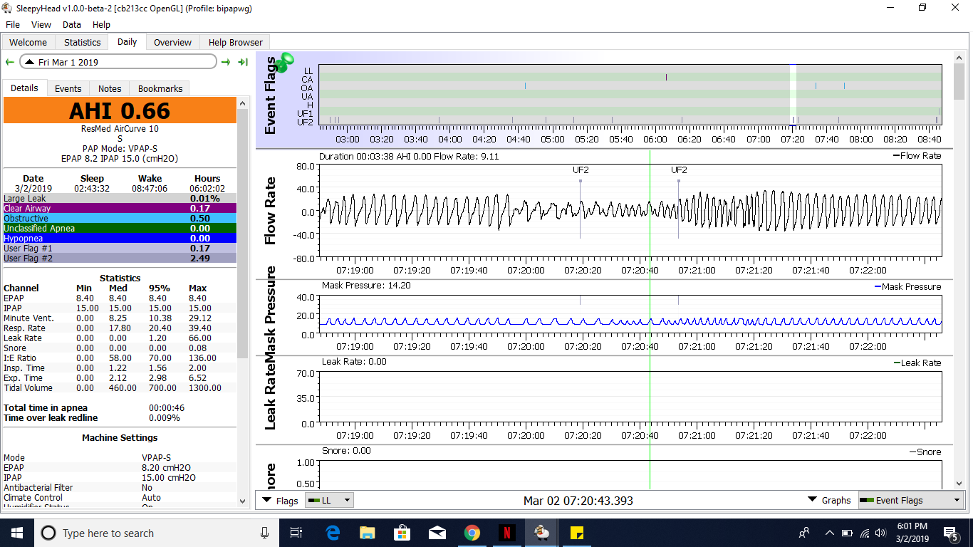 side note: As many of you might guess (or not!) - the UF1 and UF2 are user-flagged 1 and user flagged 2 events, using the functionality in sleepyhead to flag reductions in flow rate that meet certain criteria. I believe user flag 1 is a reduction of flow (I forget the %) for 8 seconds or more, and user flag 2 is a reduction of flow of 50% for 5 seconds or more.