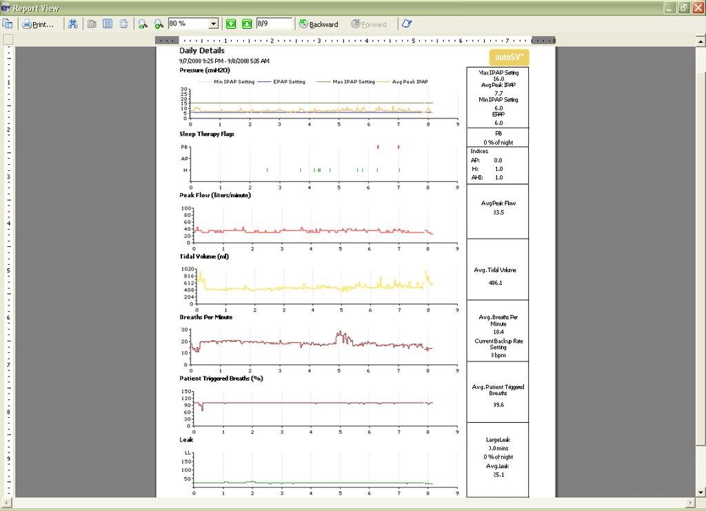 Yes, you are correct...I only have the smart card and not the software. I guess I misunderstood the purpose of that in the profile. I did however get a copy of the report from my DME. Here are some of the numbers, if that is any indication to you... Avg Peak IPAP Pressure: 8.4 cm H2O Avg % of Night ...