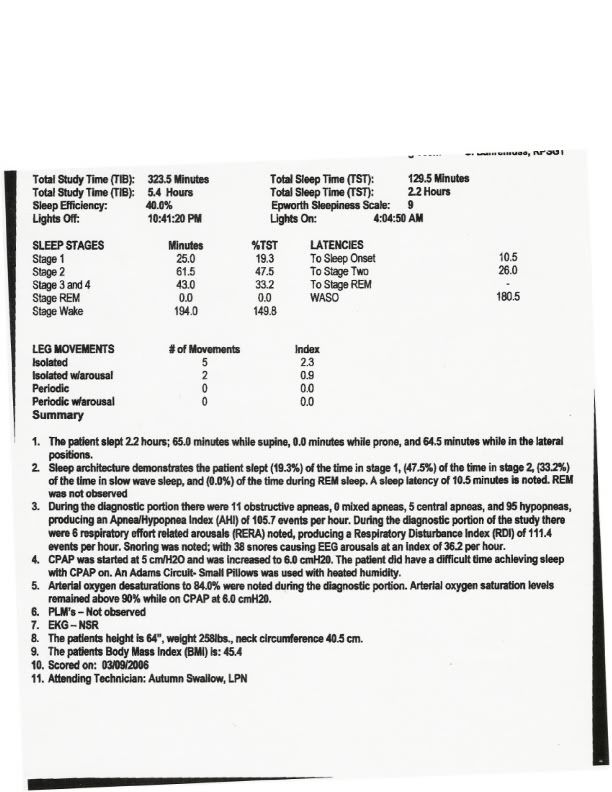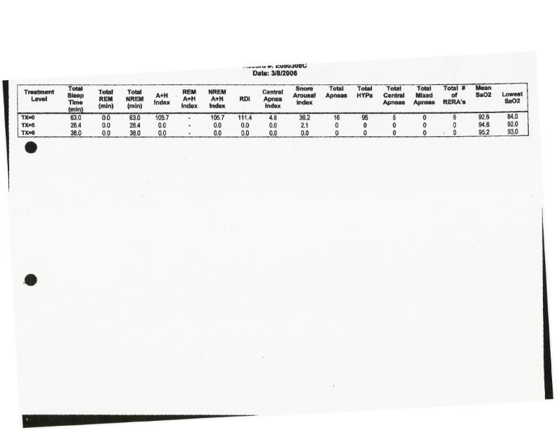 Any chance of getting those graphs too? That would really allow a good comparison, and also see how REM behaves (there should be a bunch more without the fluoxetine). Say, how many total studies have you had, anyway?cflame1 wrote:My very first study (I don't have the fancy graphs and numbers on that one), had no fluoxetine and they still put me on a xpap.