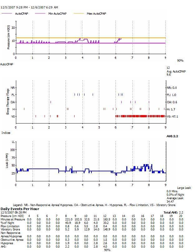 The down side is I just downloaded last nights data and it is worse than what it has been for some time. I had an average leak rate of 39 -- I have a pressure of 8 - 12. My 90% number was 12 -- many nights I don't get up to 12 at all and will average between 8 and 10. I had over 200 snores at 12 with an overall AHI of 2.3.